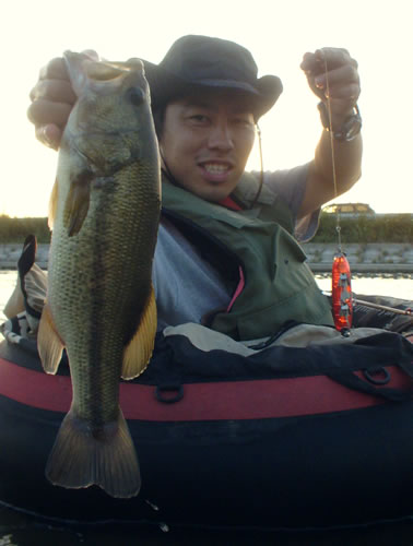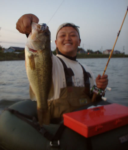 そろそろ夕マズメなんで以前にいった川に移動、これは予定通り! 入水して投げ進んでいくがなかなかバイトがない、まえは結構すぐあったのに、今日は渋いか!? と思っていると谷川チャンにバイト着水同時に吸い込まれたがフッキングせず。 その5分後、今度はわたくし、杭にピタッと付けながら改造フッカーの首振りにジュボっと吸い込むバイト良い引き!寄せてくるとサイズはたいしたことないが、慎重にハンドライディング、39センチの普通サイズ。 谷川チャンも今日はまだ集中が続いているが、さすがにちょっと切れてきた、とおもったらちょっとした木の下にピタッとタイトにキャストを決めてロングポーズ、そしてワンアクションで吸い込むようなバイト! この後はしょぼいバイト2発のらずで終了。