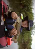 クラッパ−のウッドを投げる、今度はポイントに直角ではなく上流から下流に向けて斜にゴージャス引き、これが効いて3投目くらいで『バシュ』っとひったくるような出方!なかなかの引きで丁寧にキャッチぐっとつかんだ後も暴れる暴れる、かなり元気いいがちょっと傷多くけっこう釣られてる様子で水が悪いのか病気ぎみで色も茶色系で余り良くないが、ジャスト40はなかなかのサイズ。(写真)ここのバスはひれが長いように感じます。