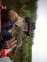 この後5投目くらいに、着水同時でルアーを飛ばされるがのらず、やはりここのバスはスレてるのか、ポイント直撃ではルアーを飛ばされるだけ、2週間前もそうだった。それではとゴージャス引きで攻めていくゴージャス引きをもっとタイトにする為にアマゾンプロップの登場、音&カラー共にこれしかない!読みが当り首振りポップ音にたまらず凄い出方!川バス特有の凄い引き!やっぱトップにでるバスはコンディションいいです!またまた40UPの44センチ!記念写真を撮ってもらいパンを食べながら余韻に浸るのもサイコ−のひととき!いや1日もしく1週間、1ヵ月、何年たっても想い出深い1匹になるのがトップのいい所です。色も良く太ってますが腹の傷が病気ぎみなのがちょっと残念。その後は音信不通で折り返して流されながら投げていく、もちろん上流から下流に引くゴージャス引!まだ暗いうちに丁寧に投げられなかったポイントで、ディクシーの首振り&ダートでタイトに攻めると激しいバイトしかしこれはのらず!結局5バイト2フッキング2キャッチ40、44で台風の速度が遅くなったので爆発はなかったがなかなか楽しめました。