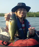 しかし、すでにジョンボート1艘、木の船で動力は竹の手漕ぎ!?が1艘の先行者がいたが、自分達が向かう方とは逆だったので、気にせず入水、すると逆側にもジョンボートが1艘!ちょと気落ちしたが、投げて見る事に。ピーカンの3時位だったので日陰を狙い、葦際にダンガンをピタっとナイスキャスト!